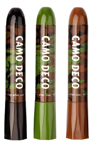Set de 3 creioane faciale de camuflaj, concepute pentru camuflaj eficient în airsoft, vânătoare, jocuri tactice și activități în aer liber. Vopseaua de camuflaj ajută la reducerea reflexiei pielii și la integrarea în mediul înconjurător pe diverse terenuri și în diferite condiții.